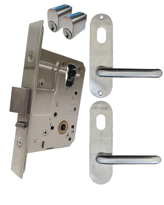 The LOCKTON 60mm Round Mortice Lock KIT 4 (DOUBLE CYLINDER) contains a LOCKTON 60mm Backset Mortice Lock, Oval Cylinders and suitable furniture.