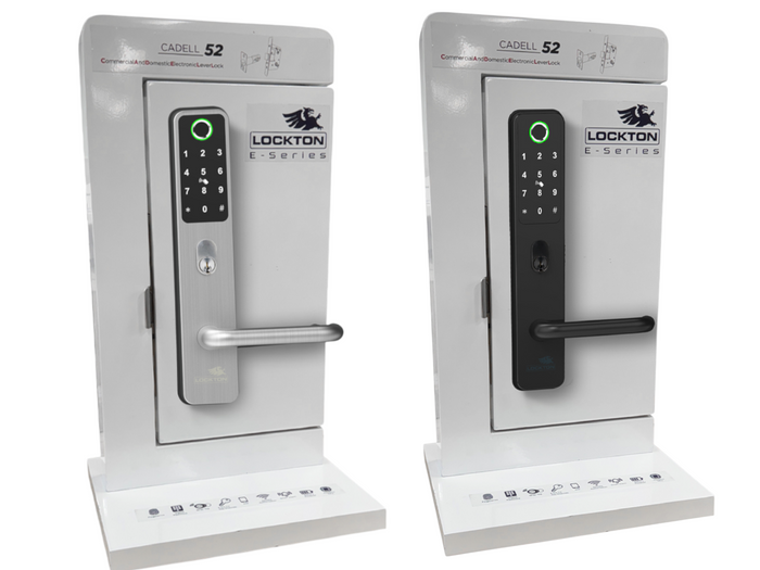 This stylish and eye catching display stand comes fitted with a fully functioning CADELL52 Electronic Lever Lock Kit fitted to a functional Mini Door frame.