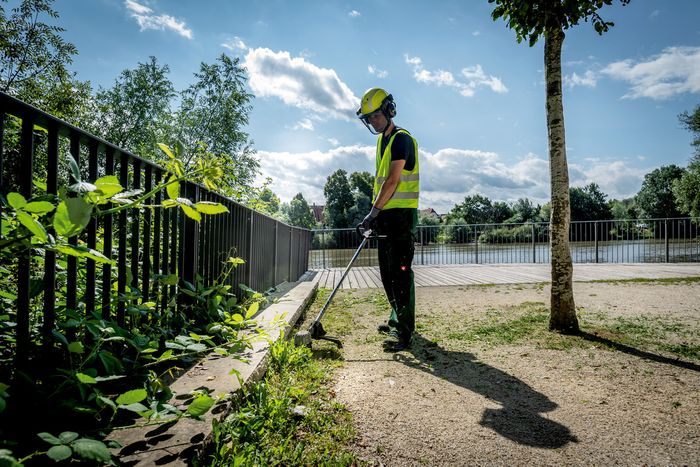 - Quiet cordless brush cutter with compact loop handle for effective working also in tight space conditions
