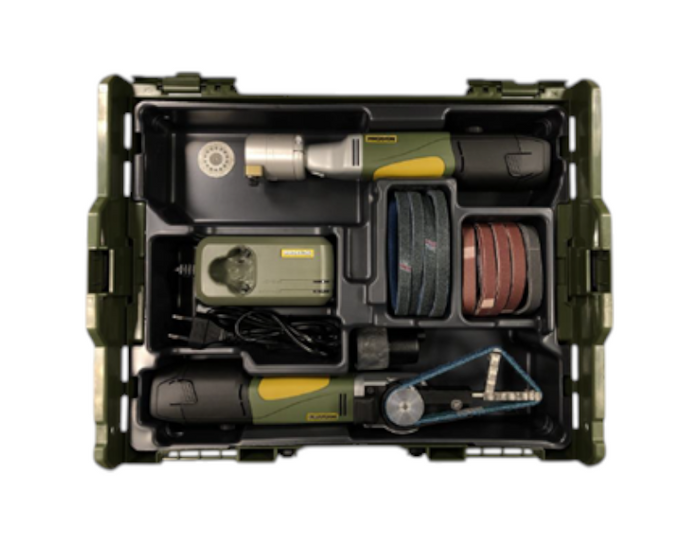 Kit is supplied with a Tube Belt Sander (RBS/A) for sanding and finishing multiple surface types, a Professional Drill/Grinder (IBS/A) for multiple applications such as Drilling, Milling, Grinding and Cutting & a Tungsten Electrode Sharpener (ESV) for finishing welding seams and TIG electrodes.