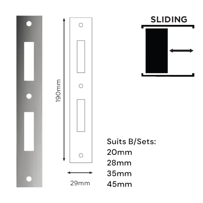 This Strike plate will suit any Sliding Door Mortice Lock in the 'E-Series' Smart Range (see RELATED PRODUCTS).