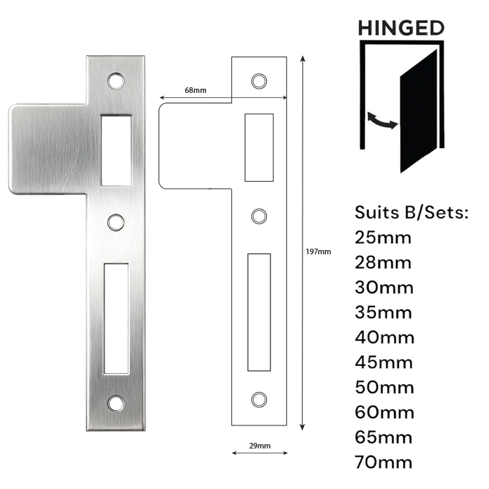 This Strike plate will suit any Hinged Door Mortice Lock in the 'E-Series' Smart Range (see RELATED PRODUCTS).
