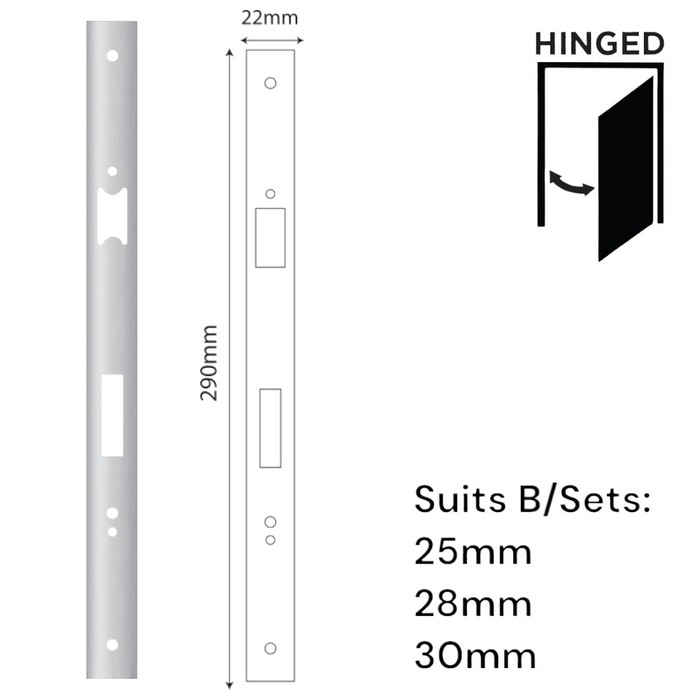 - Suits: 25 - 30mm Backset 'E-Series' Hinged Mortice Locks (See RELATED PRODUCTS)
