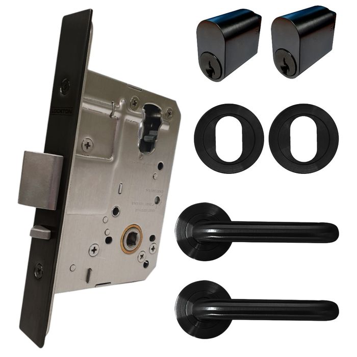 The LOCKTON 60mm Round Rose Mortice Lock KIT 4 Black (DOUBLE CYLINDER) contains a LOCKTON 60mm Backset Mortice Lock, Oval Cylinders and suitable furniture, all with Matte Black Finishes.