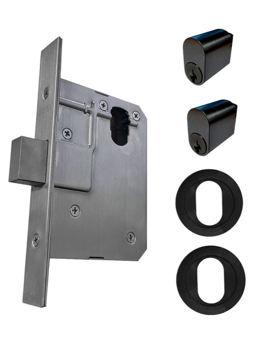 The LOCKTON 60mm Deadbolt Round Rose Mortice Lock KIT 4 (DOUBLE CYL.) contains a LOCKTON 60mm Backset Deadbolt Mortice Lock, Oval Cylinders and suitable furniture all with Matte Black finishes.
