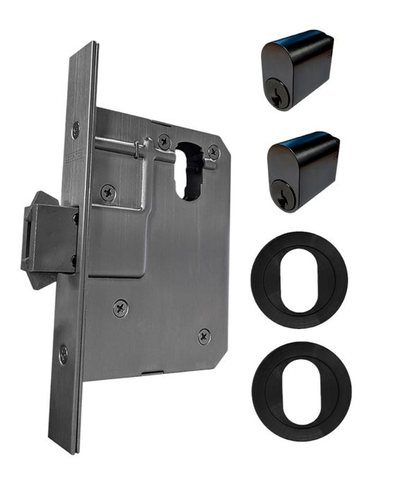 The LOCKTON 60mm Sliding Round Rose Mortice Lock KIT 4 (DOUBLE CYLINDER) contains a LOCKTON 60mm Backset Sliding Mortice Lock, Oval Cylinders and suitable furniture with Matte Black finishes.