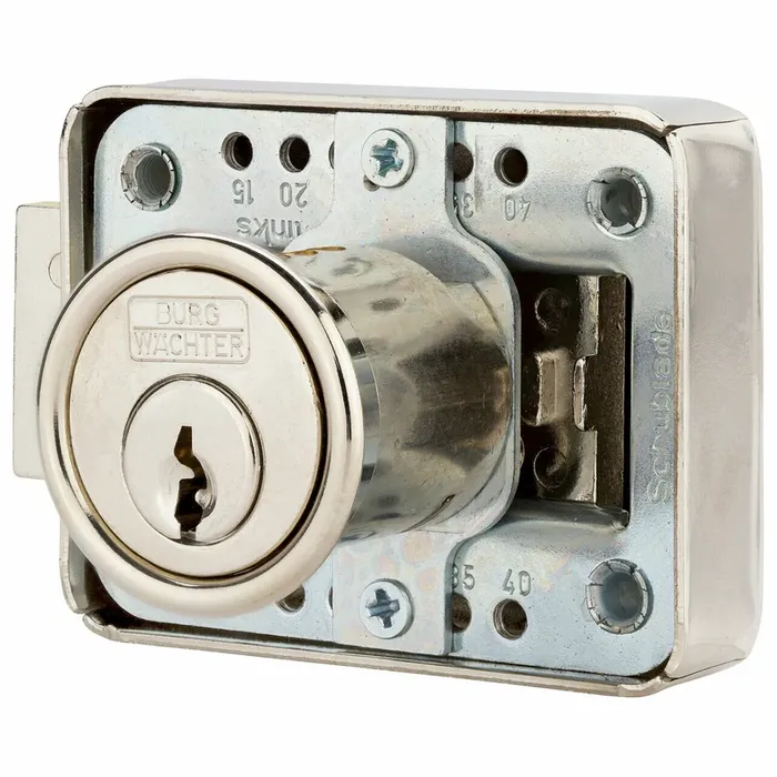 The BURG WACHTER Art. MZ-2320. Nickel Plated Brass Rim Lock with Inline Pin Cylinder and adjustable backset. Supplied with two working keys.