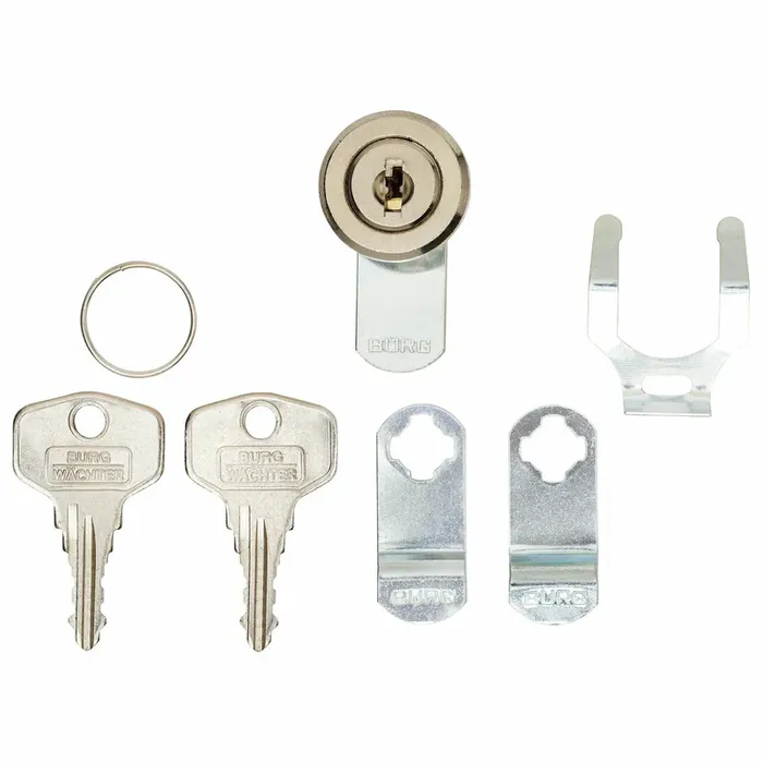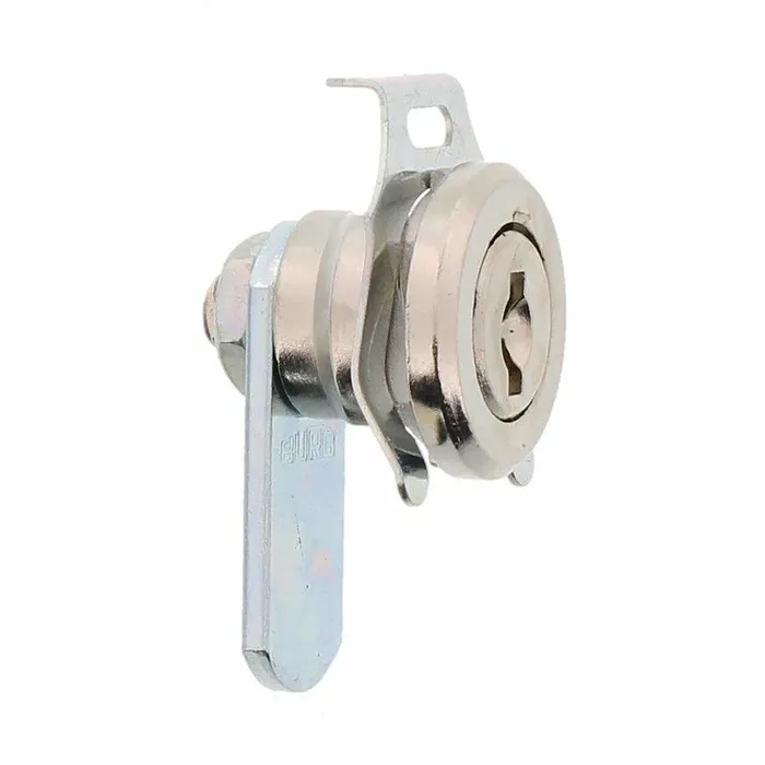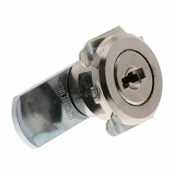 The BURG-WACHTER Art. ZS-81-SB. An all-round cam lock made of high-strength nickel-plated zinc diecast, disk cylinder with reversible key, cam adjustable at an angle of 90° with friction spring. Each lock is supplied with two working keys and three cams (1 straight, 2 offset).