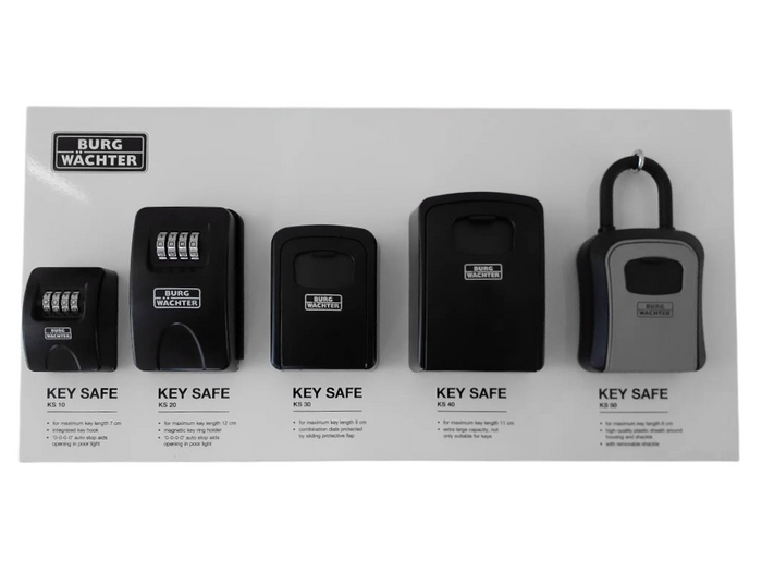BURG-WÄCHTER Display Board showcasing products from their Key Safe Product Range.