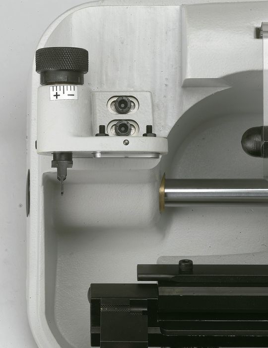 The Art. ECCO-COMBI-ABLOY is a machine designed for cutting ABLOY keys. It features a tracer point with micrometric adjustment for precision cutting, as well as a lever for safe adjustment of the cutting carriage.